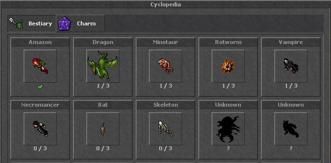 Bestiary is the collection of knowledge acquired by your character about creatures. Initially, every creature itself will be displayed as silhouettes. You can gain information about creatures and thereby unlock and complete their Bestiary entries. To unlock an entry, you will have to kill its corresponding creature. The first kill will open the entry and reveal the creature's name, sprite and its difficulty level.